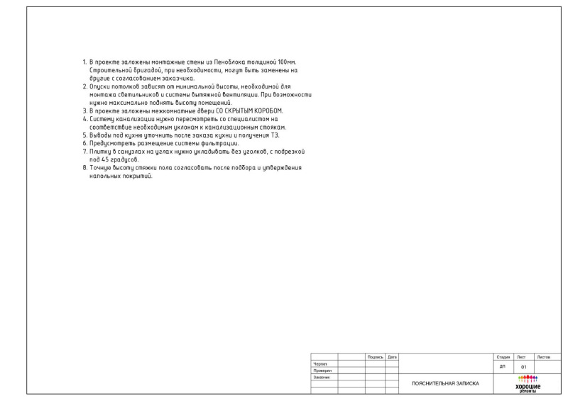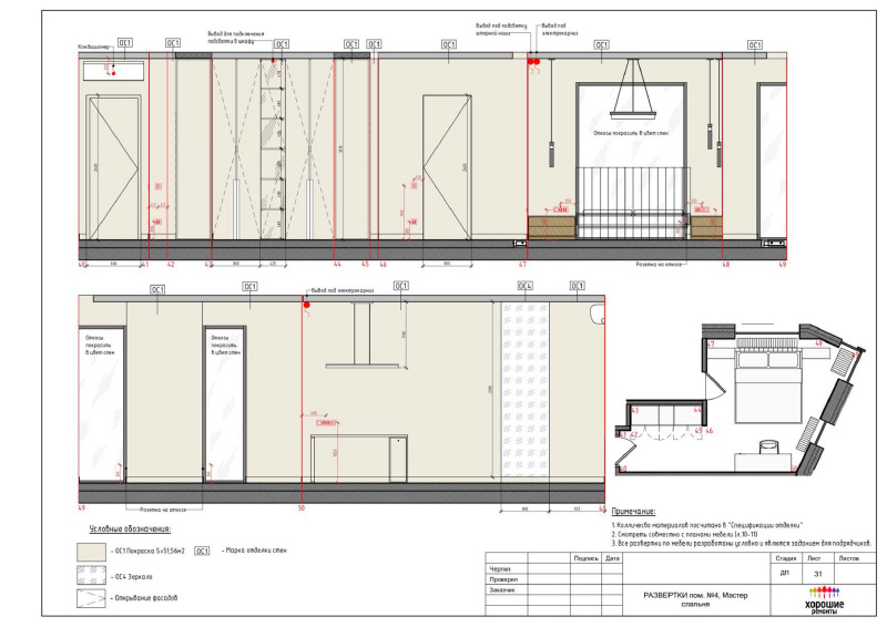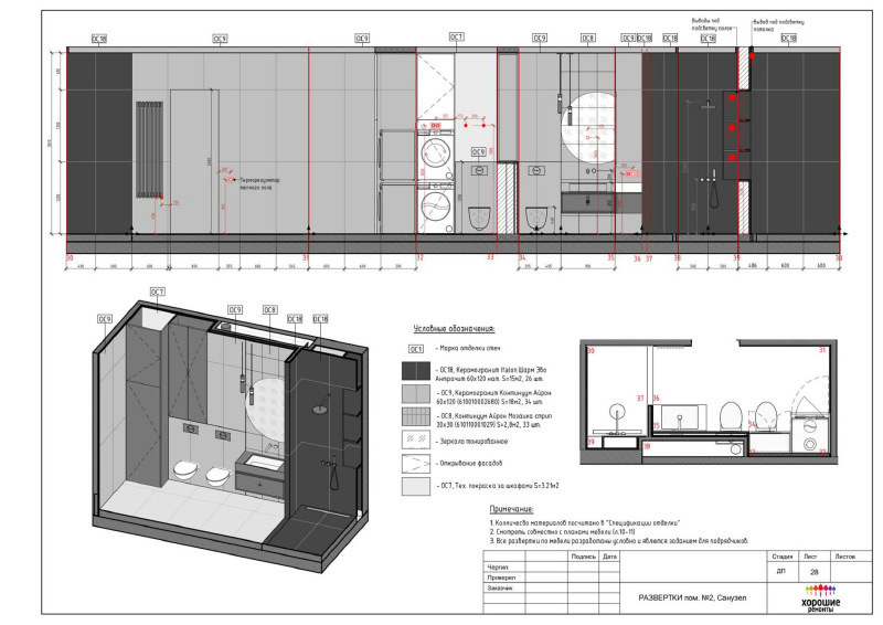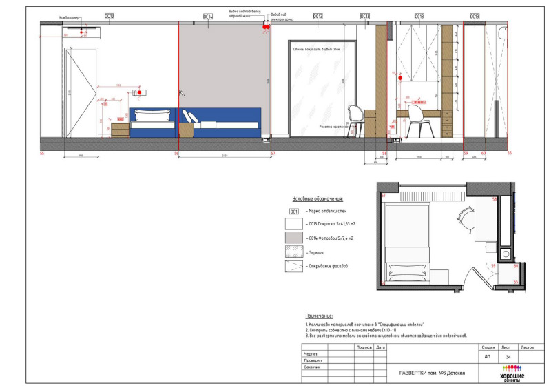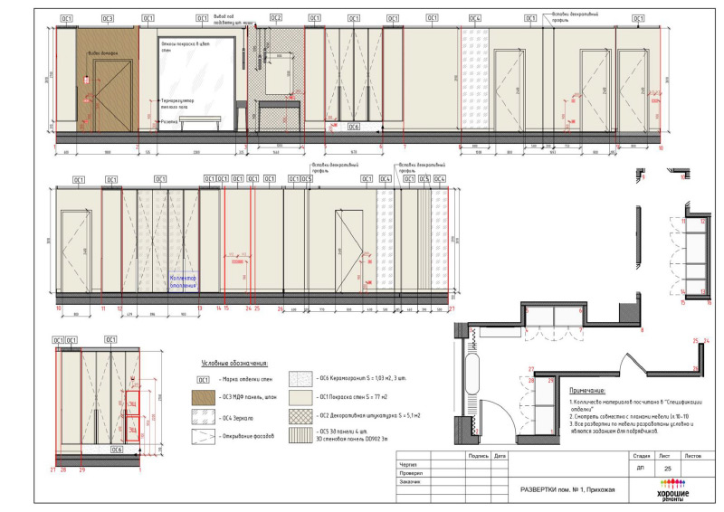 | Развертки стен с указанием типа отделочных материалов |